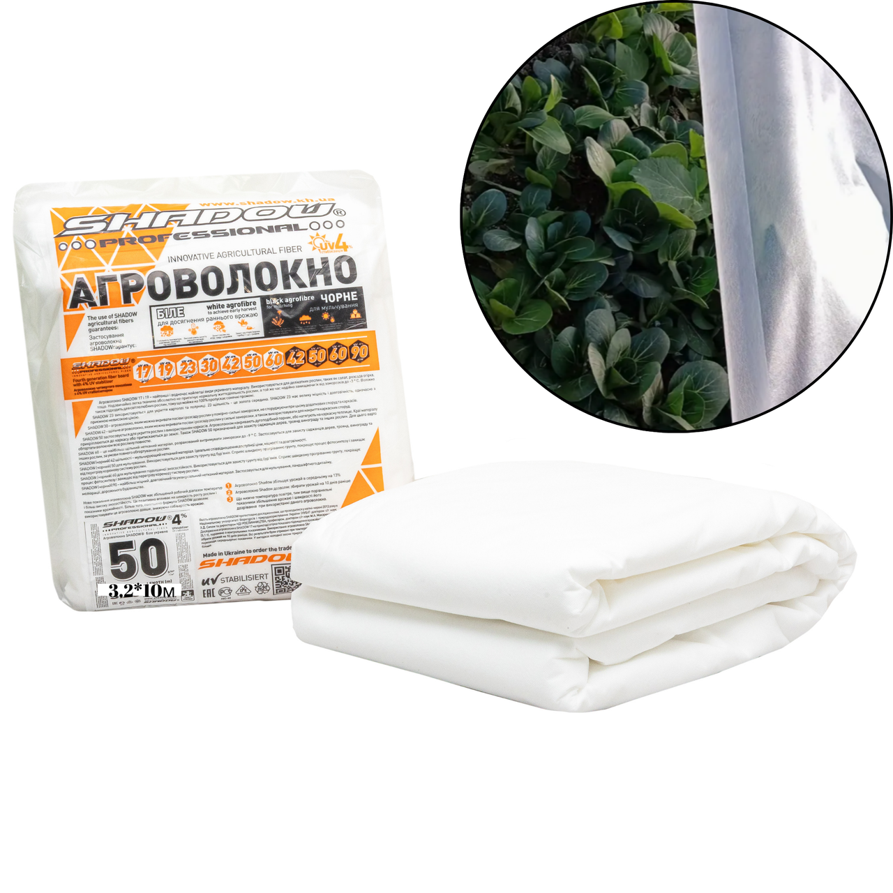 ТМ “Shadow” пропонує біле агроволокно на метраж щільністю 50 г/м2, ширина відрізу 3.2, а довжина його 10 метрів, що дуже зручно та вигідно для невеликих ділянок.