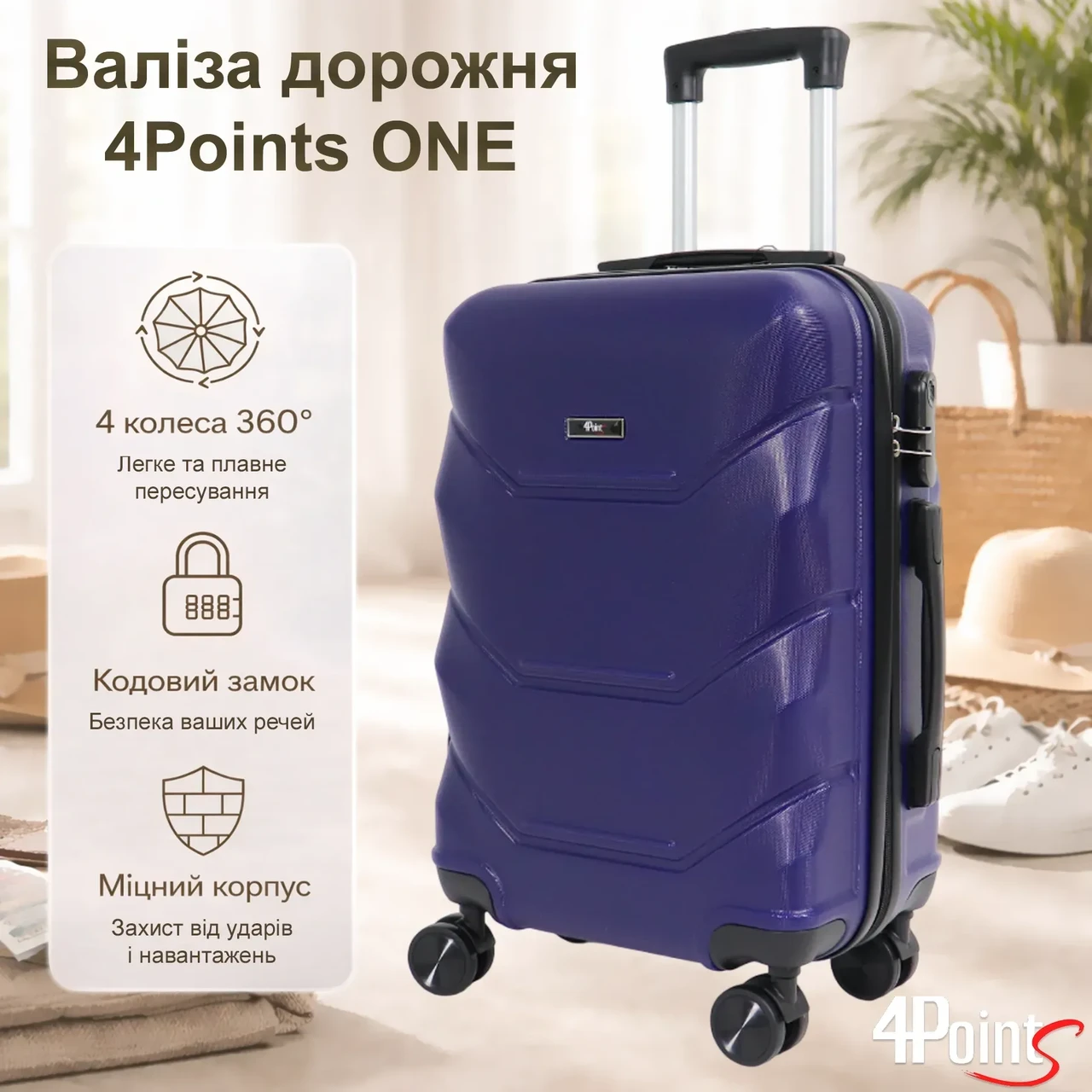 Валіза 4Points ONE — це поєднання стильного дизайну, міцного корпусу та максимальної зручності в подорожах. Ідеальний вибір для тих, хто цінує надійність, легкість та комфорт у кожній поїздці — від короткого вікенду до тривалих подорожей.
