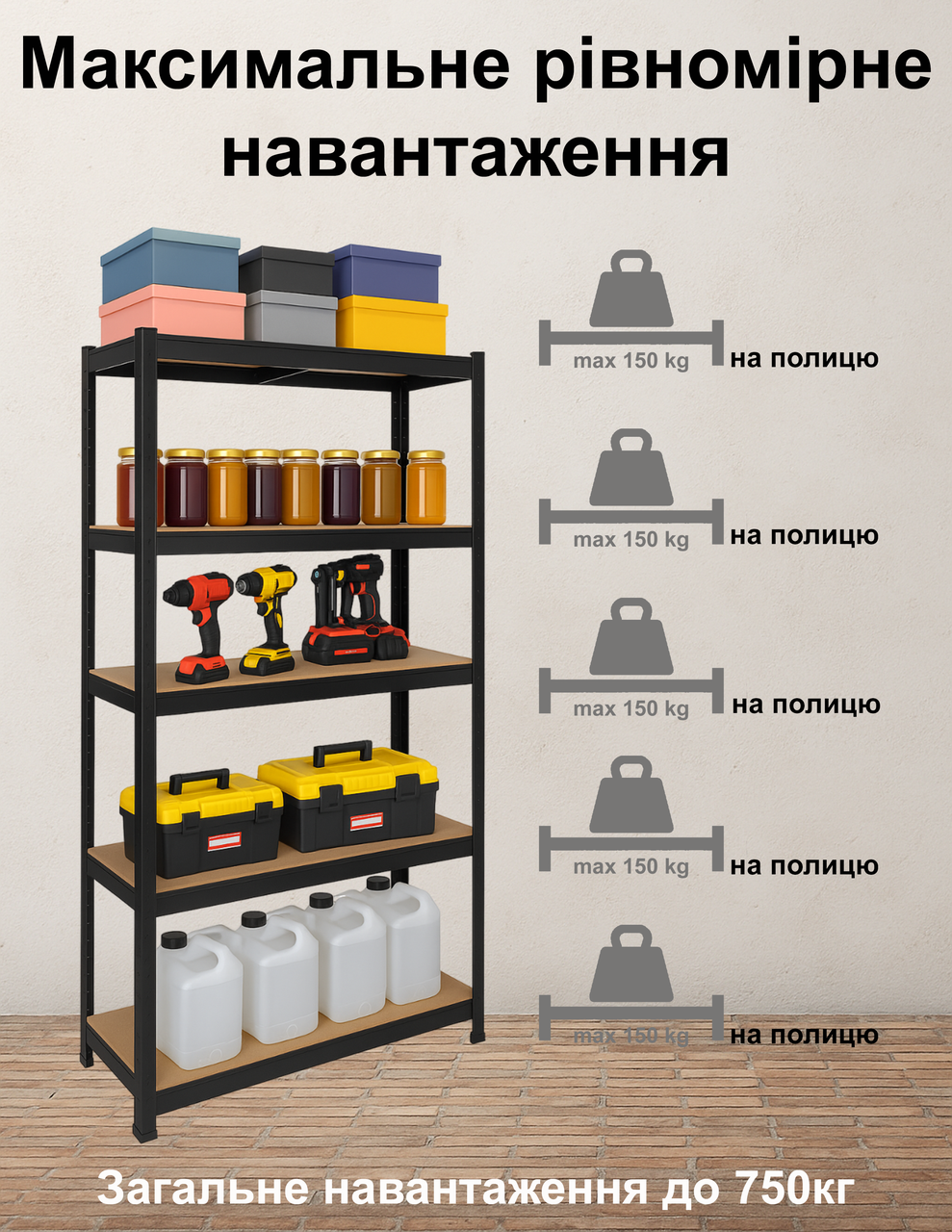 Так, стелаж розрахований на рівномірне навантаження до 150 кг на кожну полицю та до 750 кг загального навантаження, тому без проблем витримає інструменти, каністри, будматеріали, коробки та обладнання.