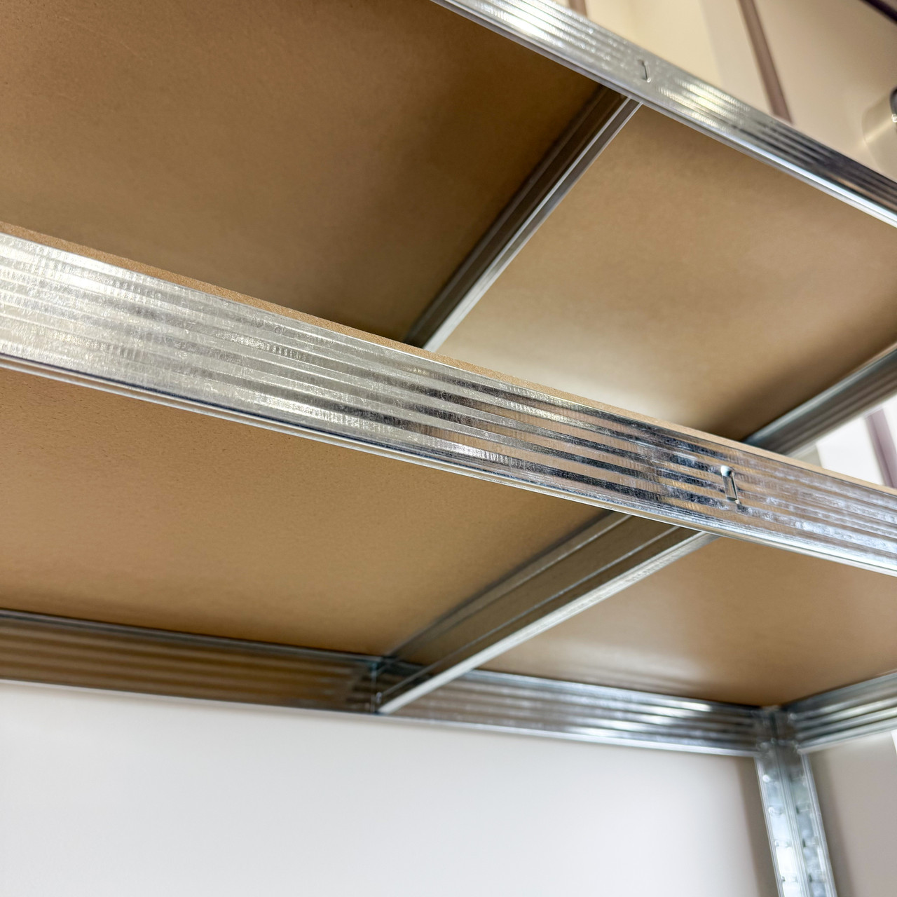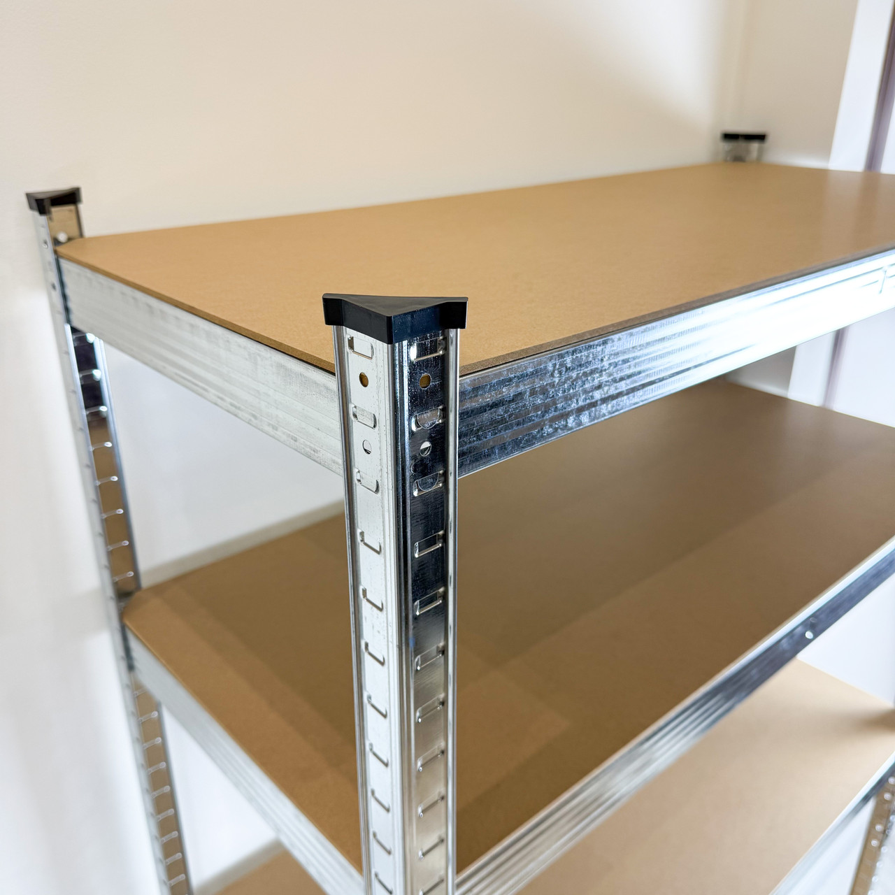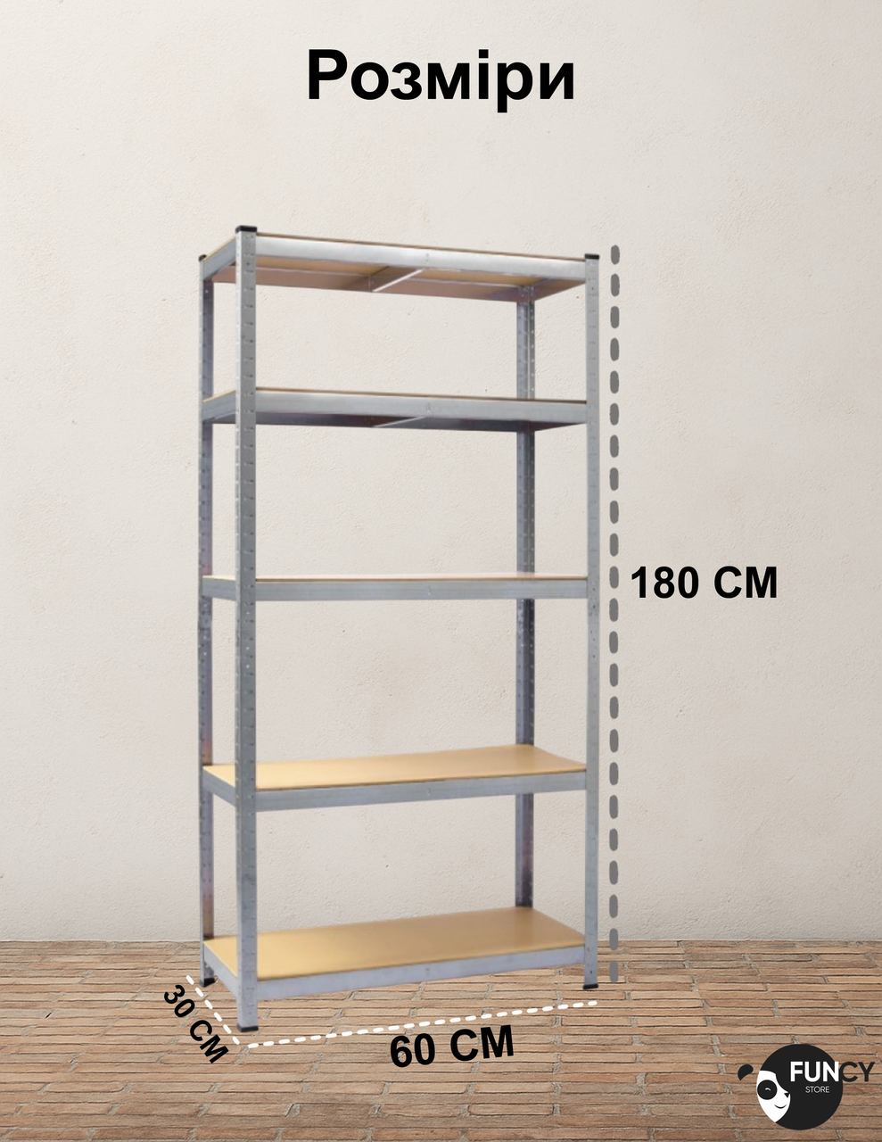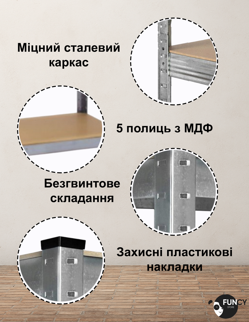 Каркас виконаний із міцної оцинкованої сталі товщиною 0,6 мм, яка не піддається корозії навіть у вологих приміщеннях. Полиці виготовлені з МДФ товщиною 4 мм, стійкого до навантажень і деформацій. Висота полиць регулюється з кроком 40 мм, що дозволяє легко адаптувати простір під різні типи предметів.