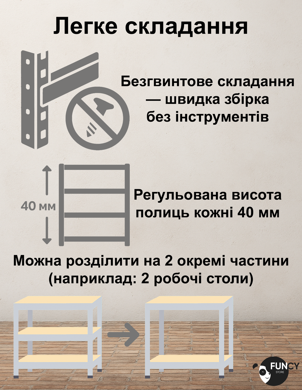 Завдяки безгвинтовій системі складання, стелаж збирається швидко та без використання інструментів. Додатковою перевагою є можливість розділити конструкцію на два окремі стелажі або робочі столи, що зручно для майстерень та складів. Пластикові заглушки захищають підлогу від подряпин, а закруглені краї роблять користування безпечним.