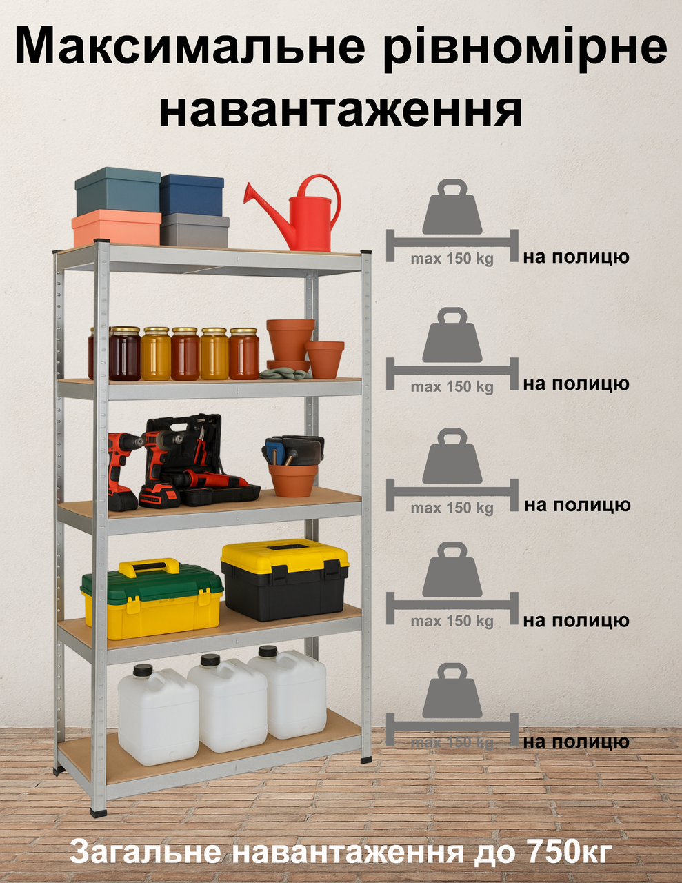 Так, стелаж розрахований на рівномірне навантаження до 150 кг на кожну полицю та до 750 кг загального навантаження, тому без проблем витримає інструменти, каністри, будматеріали, коробки та обладнання.