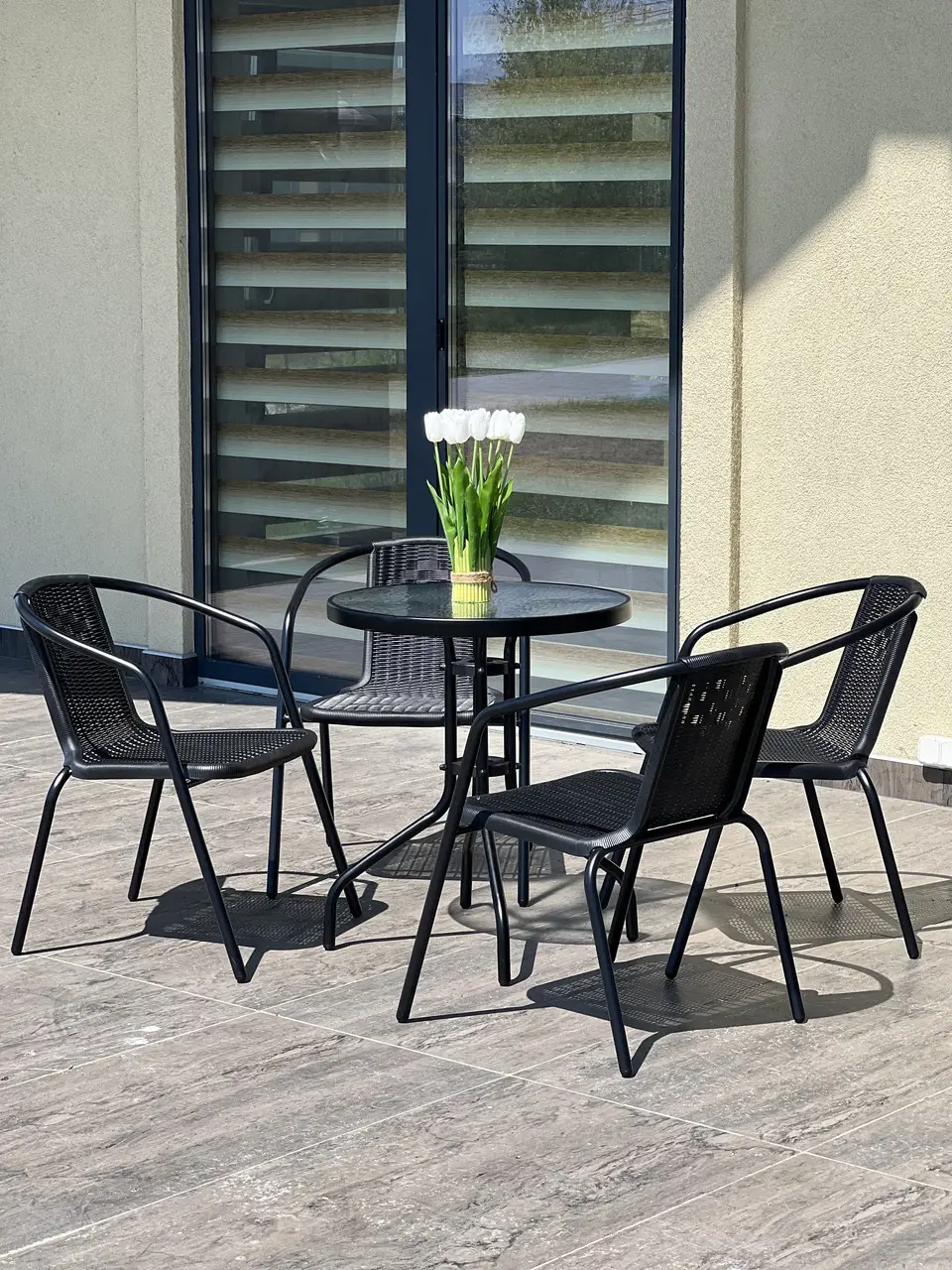 - Матеріали: стіл зі скляною стільницею діаметром 60 см, крісла з металевою рамою і сидінням із ротанга.