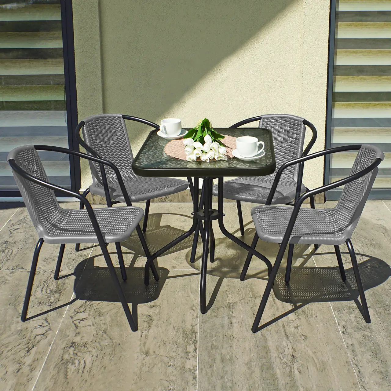 Комплект включає квадратний стіл розміром 60х60 см із міцною стільницею із загартованого скла і чотири крісла з штучного ротанга з міцною металевою рамою. Меблі стійкі до впливу вологи, ультрафіолету та погодних умов. Компактні розміри дозволяють використовувати комплект навіть у невеликих зонах.
