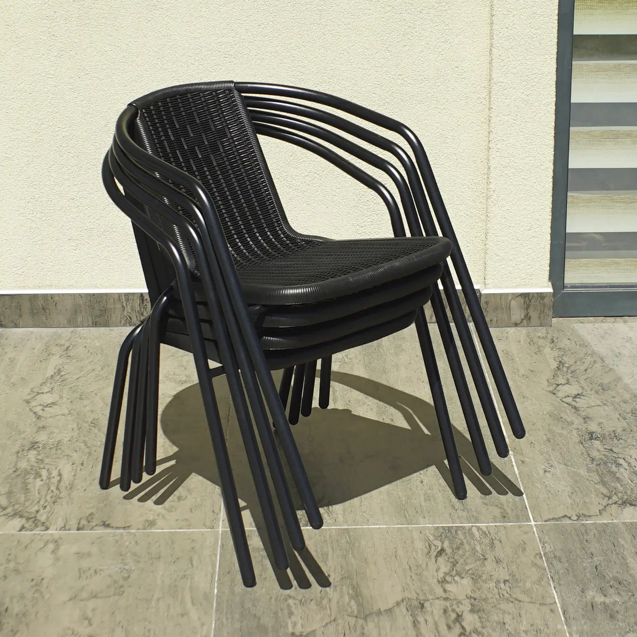 - Матеріали: стіл зі скляною стільницею діаметром 80 см, крісла з металевою рамою і сидінням із ротанга.
