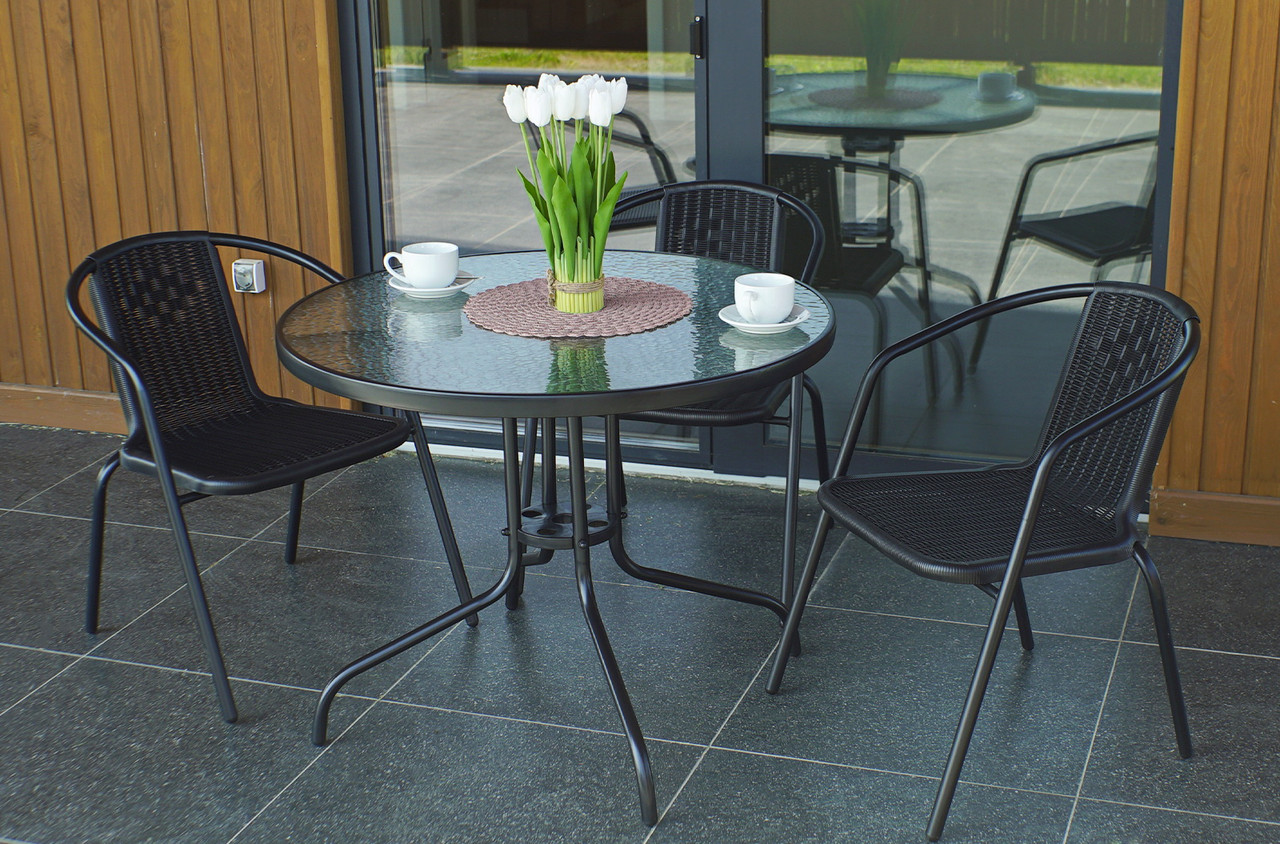 Комплект включає великий круглий стіл із міцною стільницею із загартованого скла і три крісла з штучного ротанга на металевій рамі. Усі елементи набору стійкі до впливу вологи, ультрафіолету і погодних умов.