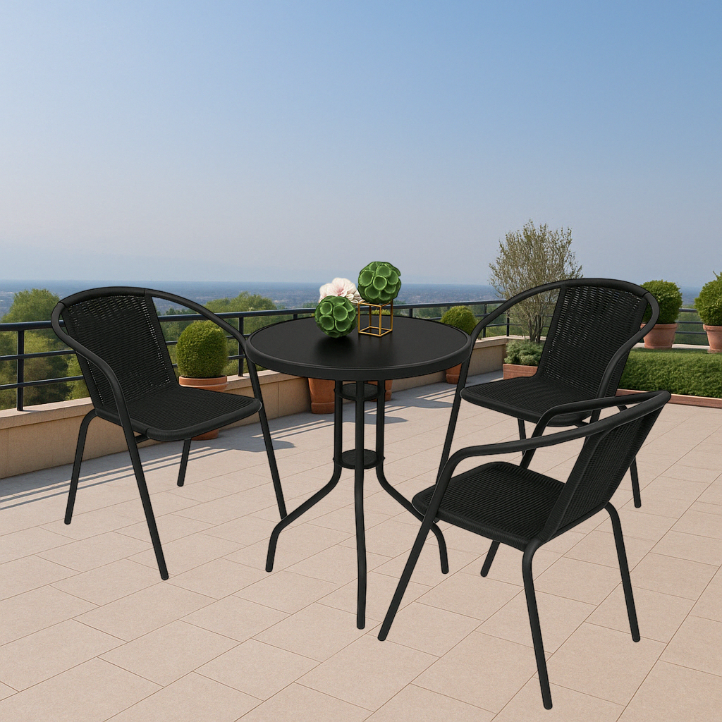 Комплект включає круглий стіл діаметром 60 см із міцною стільницею із чорного матового металу і три крісла з штучного ротанга з міцною металевою рамою. Меблі стійкі до впливу вологи, ультрафіолету та погодних умов. Компактні розміри роблять комплект підходящим навіть для невеликих просторів, включаючи балкони та маленькі тераси.