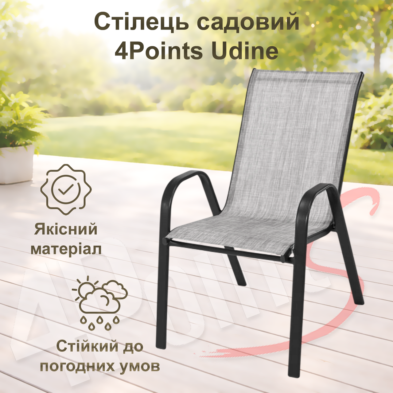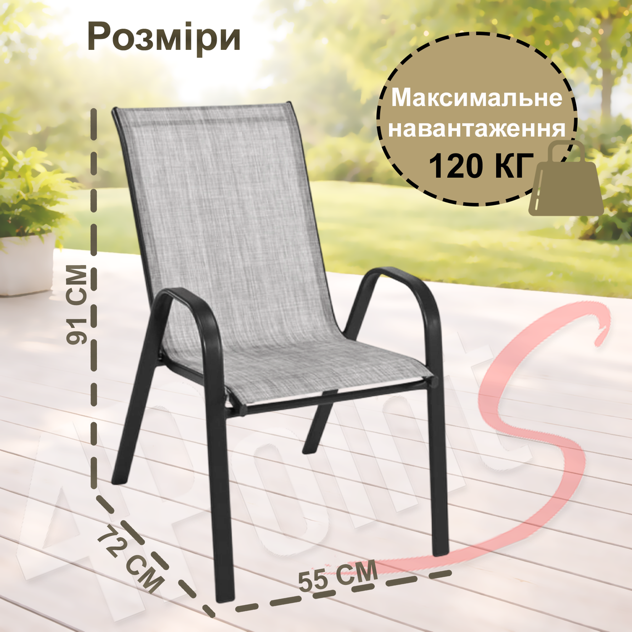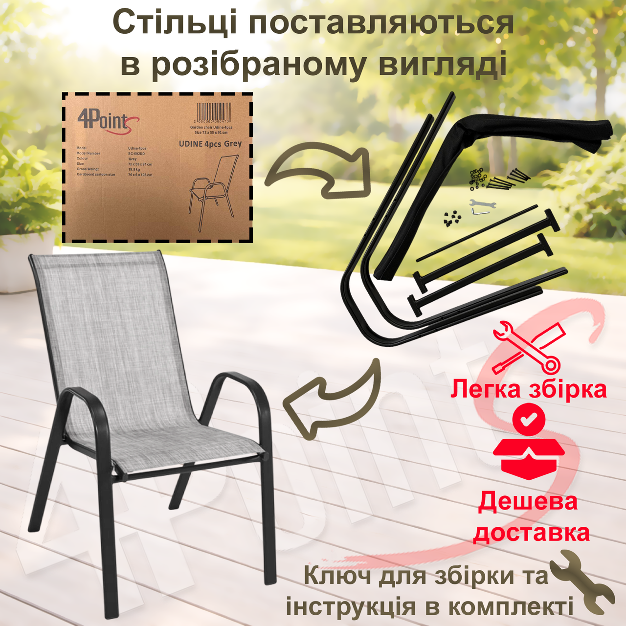 - 2 стільці з текстилену на металевому каркасі, які вирізняються дихаючим матеріалом, стійким до ультрафіолету та вологи.