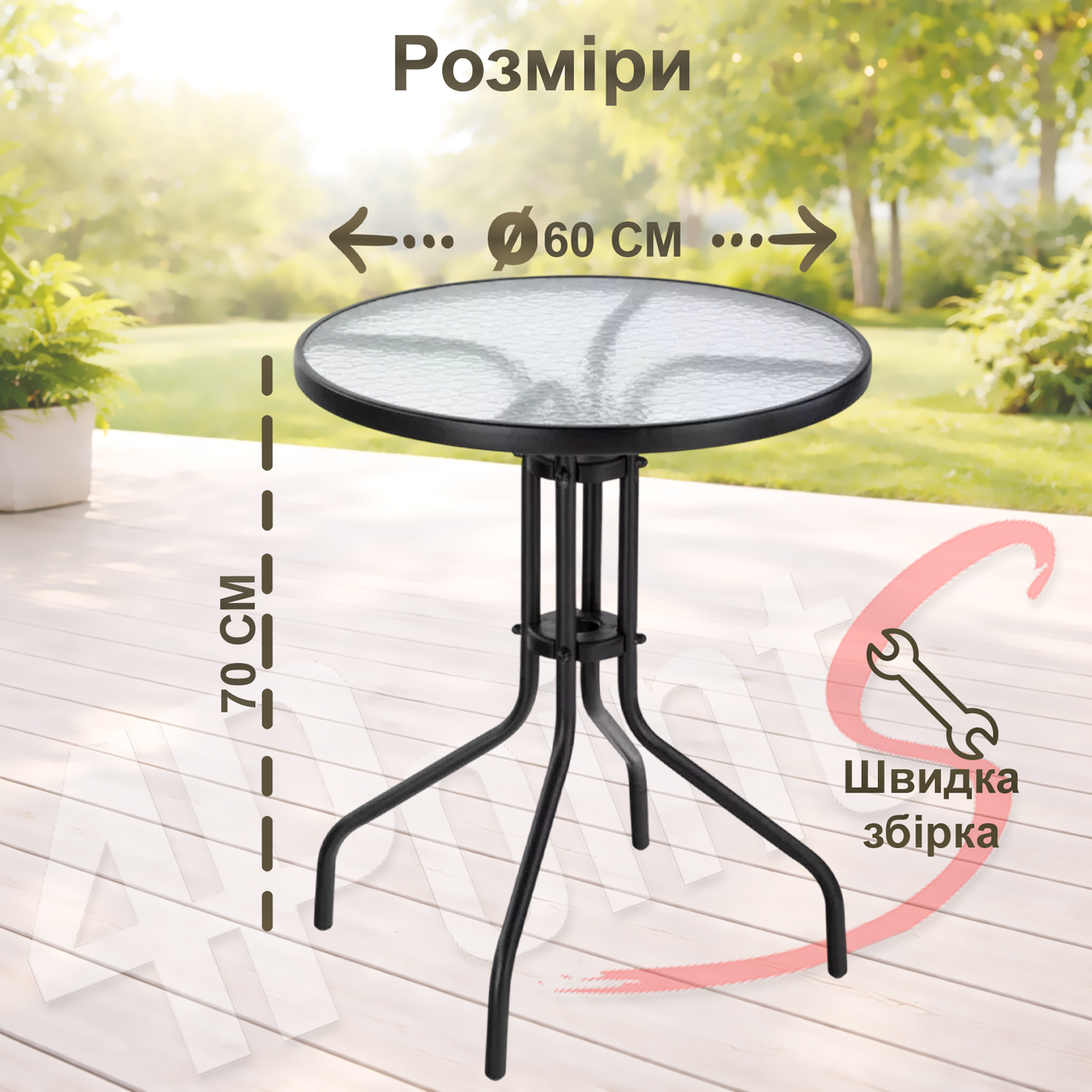 - Круглий стіл діаметром 60 см із загартованим склом, яке забезпечує стійкість до подряпин, вологи та перепадів температур.