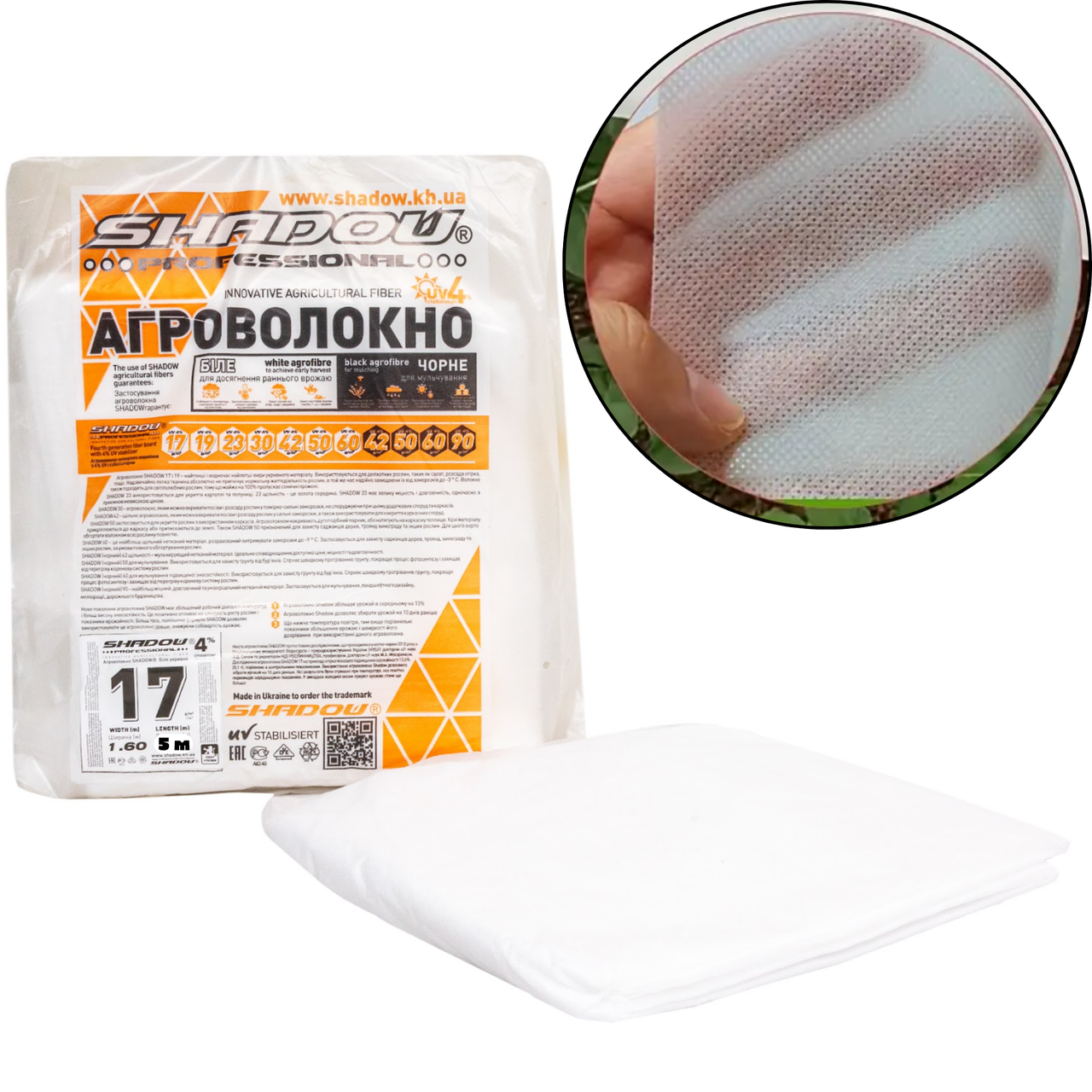 ТМ “Shadow” пропонує біле агроволокно на метраж щільністю 17 г/м2, ширина відрізка 1.6, а довжина його 5 метрів, що дуже зручно і вигідно для маленьких ділянок.